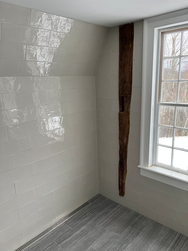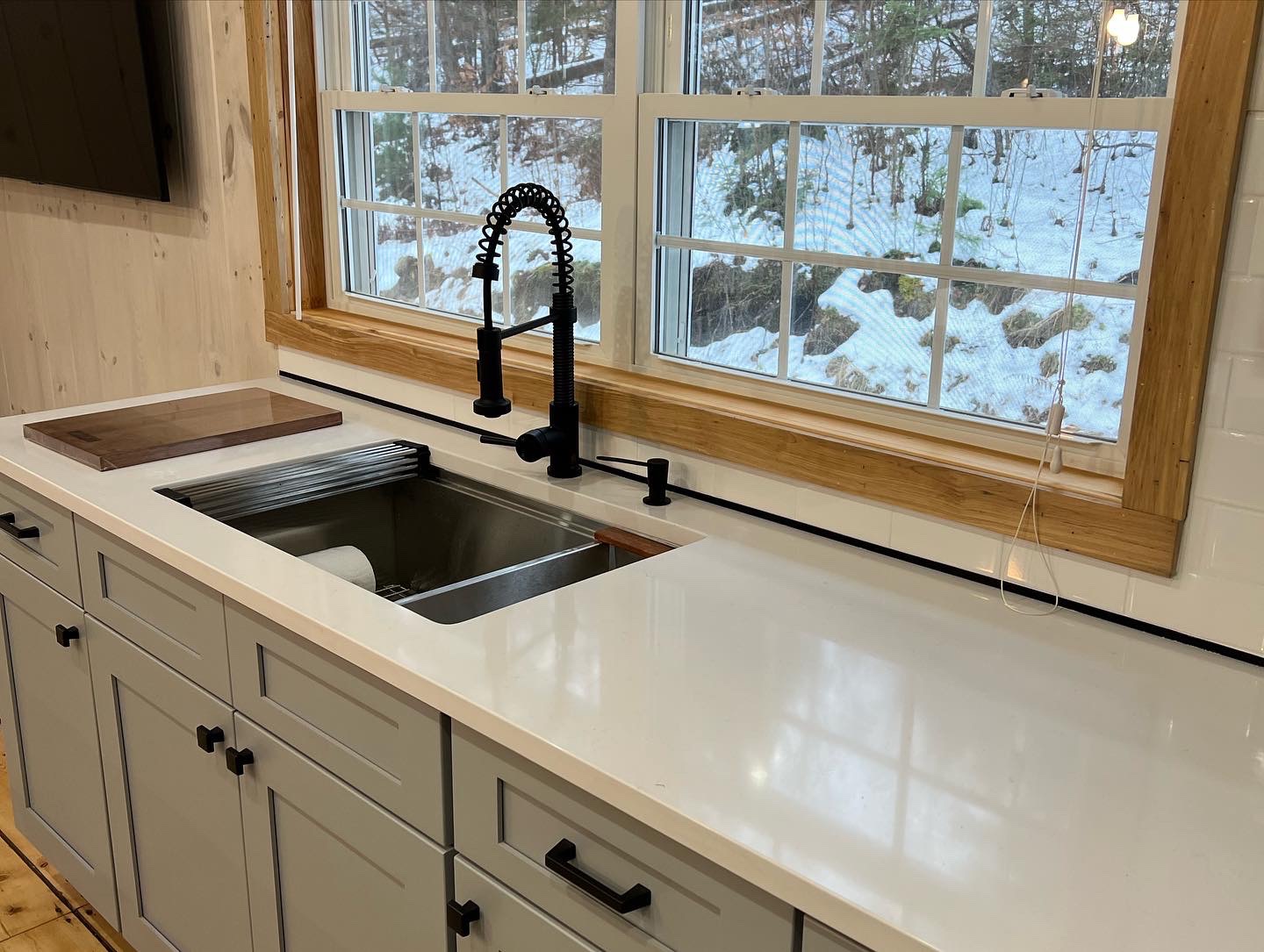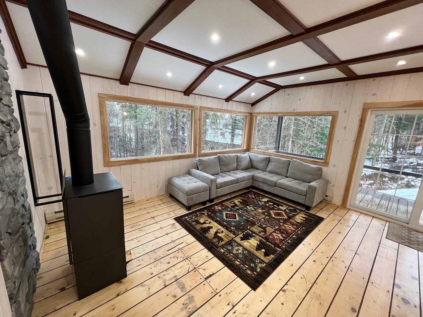 Large format, custom built picture windows added to bring light to a dark space and give the feeling of being in a treehouse.