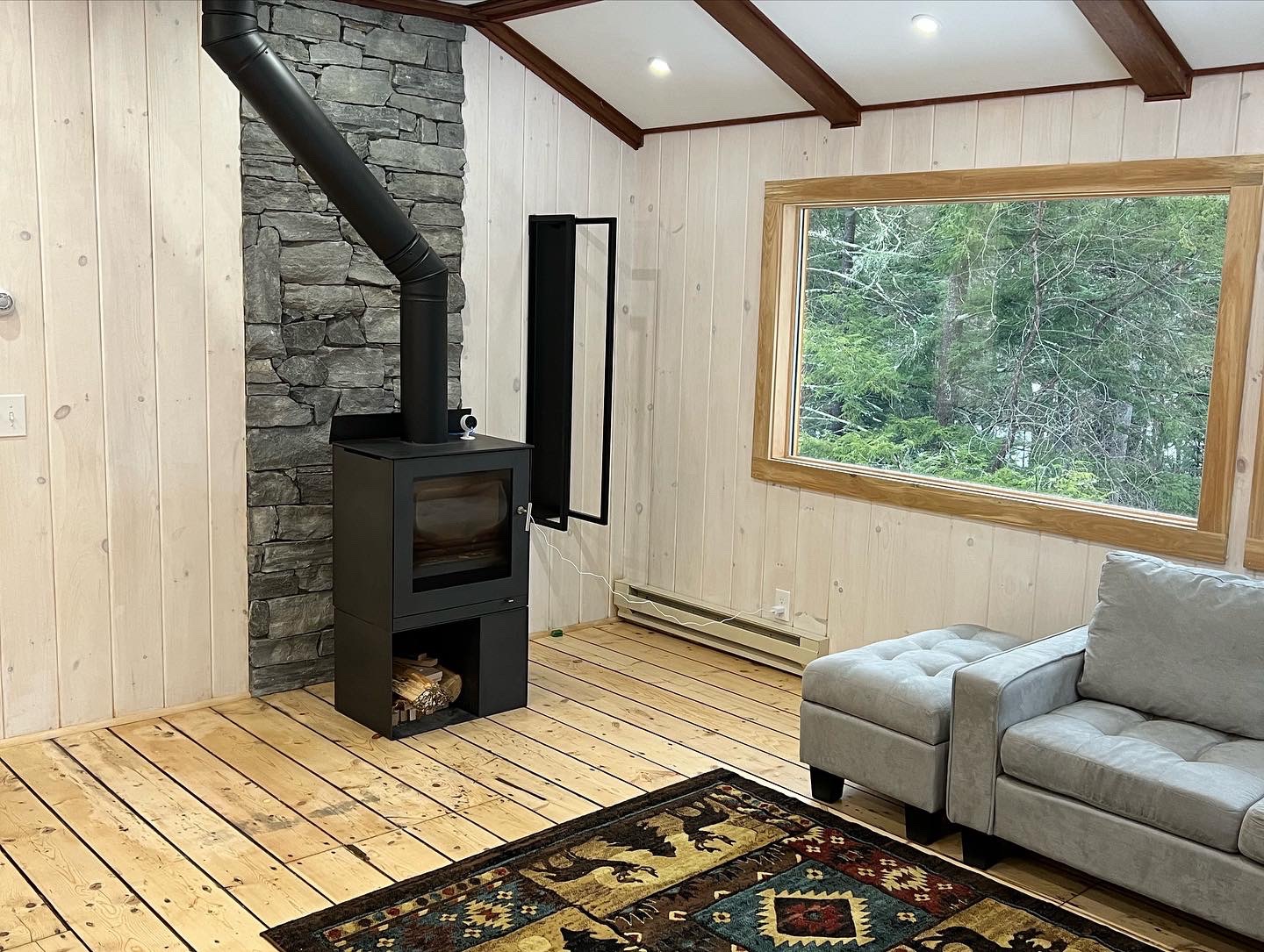 Stone wall built behind zig zag Rais wood stove using local Vermont stone.